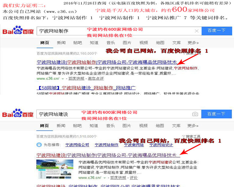 浙江省寧波市是千萬人口的大城市,約有600家網(wǎng)絡(luò)公司,競(jìng)爭(zhēng)異常厲害,“寧波網(wǎng)站建設(shè)”“寧波網(wǎng)站制作”這二個(gè)關(guān)鍵詞,本公司網(wǎng)站多年來基本上百度快照排在第1名(360搜索也多數(shù)排名在1名)...